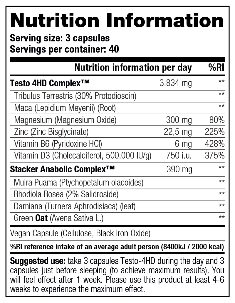 Testo 4HD contains only ingredients that work, with the highest possible percentage of the active ingredient. So not just Tribulus, but the highest possible percentage of the active extract: 30% protodioscin.